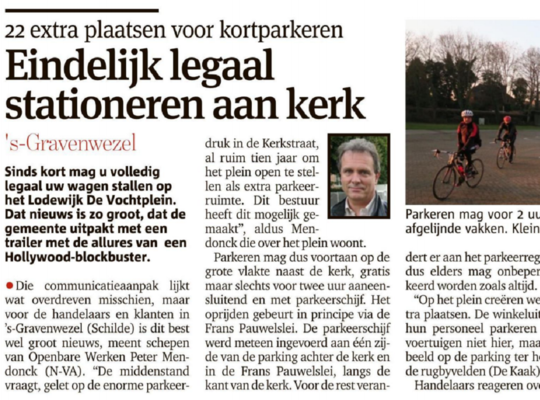 Sinds begin december 2016 zijn er 22 extra parkeerplaatsen op het Lodewijk De Vochtplein (’s-Gravenwezel). Deze ingreep kwam er op initiatief van schepen van Lokale Economie Peter Mendonck.